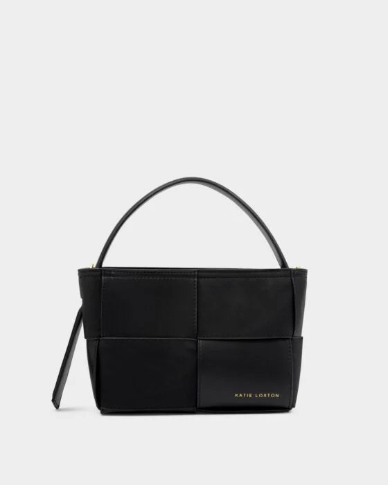 Taya Top Handle Bag in Black features a woven panel texture that adds a contemporary twist to a timeless silhouette, combining contrasting faux suede and vegan leather. Designed with an asymmetrical handle and a detachable crossbody strap for versatile styling, Taya is a standout piece for the season.