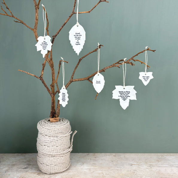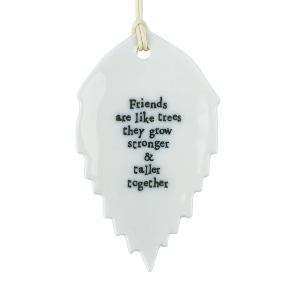 Celebrate the strength and growth of friendship with the East of India Hanging Porcelain Keepsake Leaf. This beautifully crafted porcelain decoration features the heartfelt quote "Friends are like trees; they grow stronger and taller together", symbolizing the enduring bond and support between friends.
